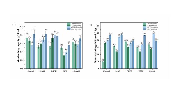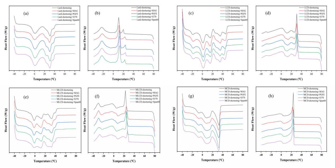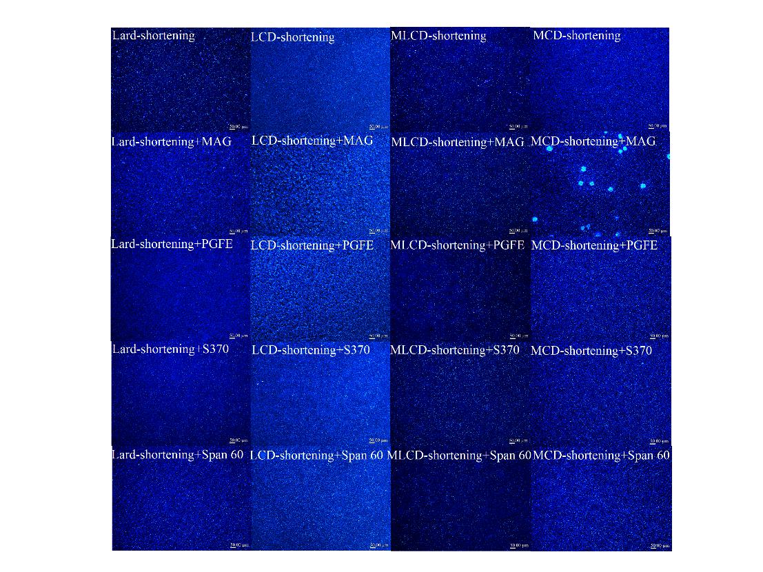 确定了与低熔点花生油甘油二酯油的复配比例为:MCD-起酥油;MCD-oil : PO-DAG-oil = 6 : 4(w/w);MLCD-起酥油;MLCD-oil : PO-DAG-oil = 6 : 4(w/w);LCD-起酥油;LCD-oil : PO-DAG-oil = 4:6(w/w),混合体系均以共晶形式存在。MCD-起酥油中添加乳化剂后吸水性和酪化性均降低。其中MCD-起酥油添加MAG后出现了起砂现象,硬度和G'均提高,添加PGFE、S370和Span 60后脂肪晶体出现细微增大,硬度和G'降低。MLCD-起酥油中添加乳化剂后吸水性降低。其中向MLCD-起酥油中添加MAG和PGFE酪化性提高,添加S370和Span 60降低酪化性。除添加S370外,其他三种乳化剂均降低了MLCD-起酥油的硬度和G'。LCD-起酥油中添加乳化剂后吸水性降低,硬度和G'降低。LCD-起酥油中添加MAG和PGFE后晶体出现聚集导致尺寸变大。除添加PGFE外,其他三种乳化剂均降低了LCD-起酥油的酪化性。