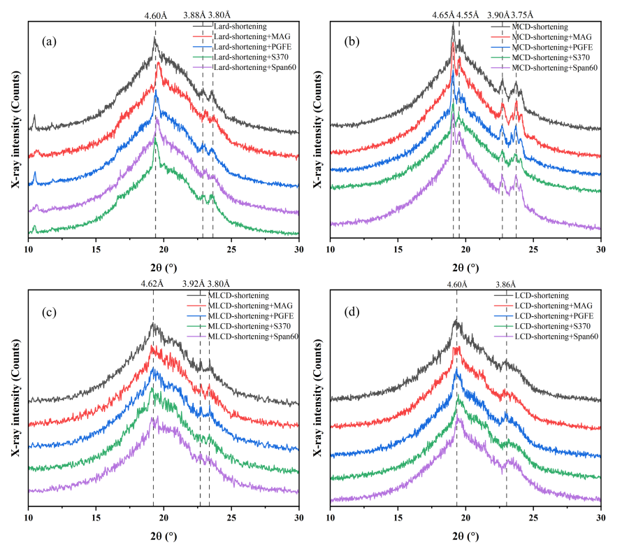 图4 四种起酥油添加乳化剂前后的X射线衍射谱图
