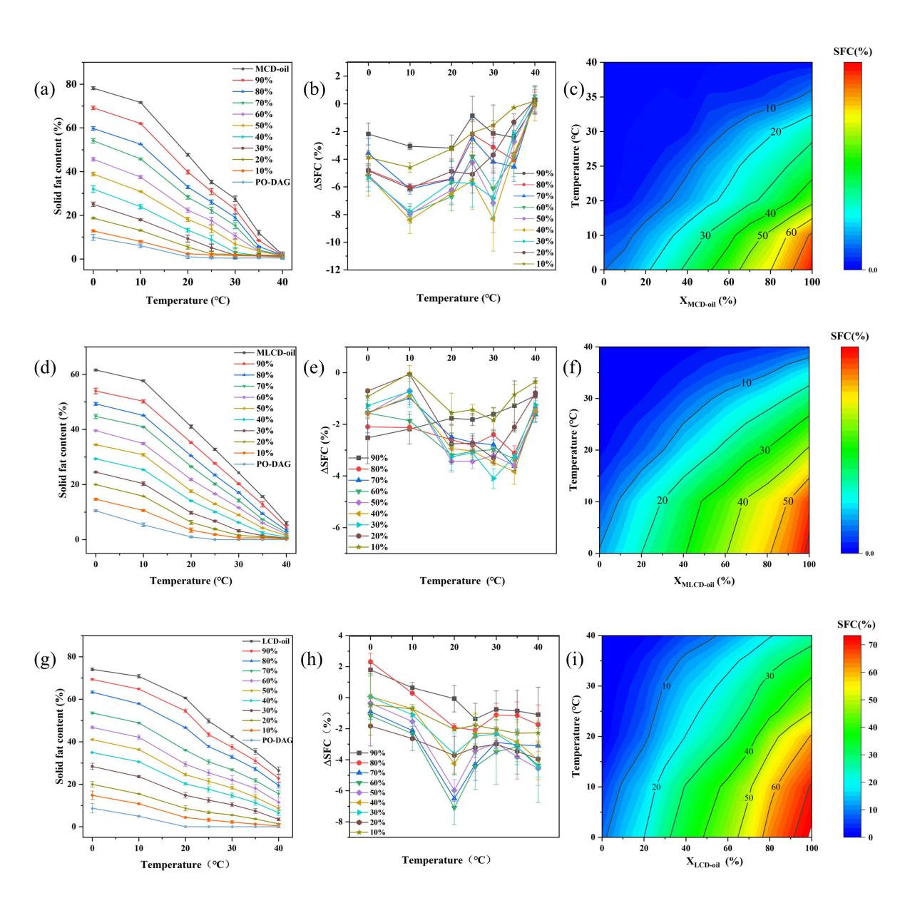 图1 MCD-oil—PO-DAG、MLCD-oil—PO-DAG和LCD-oil—PO-DAG二元复合体系的实测SFC曲线、ΔSFC曲线和等固相图