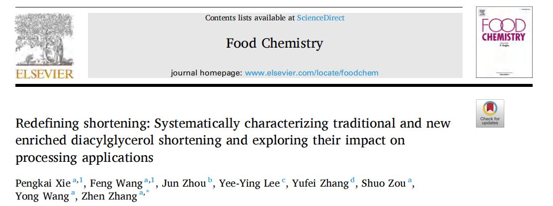 Xie Pengkai, Wang Feng, Zhou Jun, Lee Yee-Ying, Zhang Yufei, Zou Shuo, Wang Yong & Zhang Zhen. (2025). Redefining shortening: Systematically characterizing traditional and new enriched diacylglycerol shortening and exploring their impact on processing applications. Food Chemistry, 466, 142196.