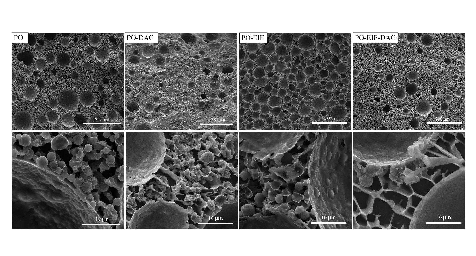 本文以棕榈液油为原料,通过酶法制备酯交换油脂(PO-EIE)、甘油二酯(PO-DAG)和酯交换油脂再甘油二酯化油脂(PO-EIE-DAG)。首先系统探究四种基础油的结晶性质的变化,其次探究在脂肪球界面上的吸附性质的差异,进而探究其在脂肪球部分聚结性质的影响机制。最后选取搅打性能表现优异的基础油进行复配来强化搅打性能,并对泡沫质量进行全面评价,以确保满足实际生产的需要。