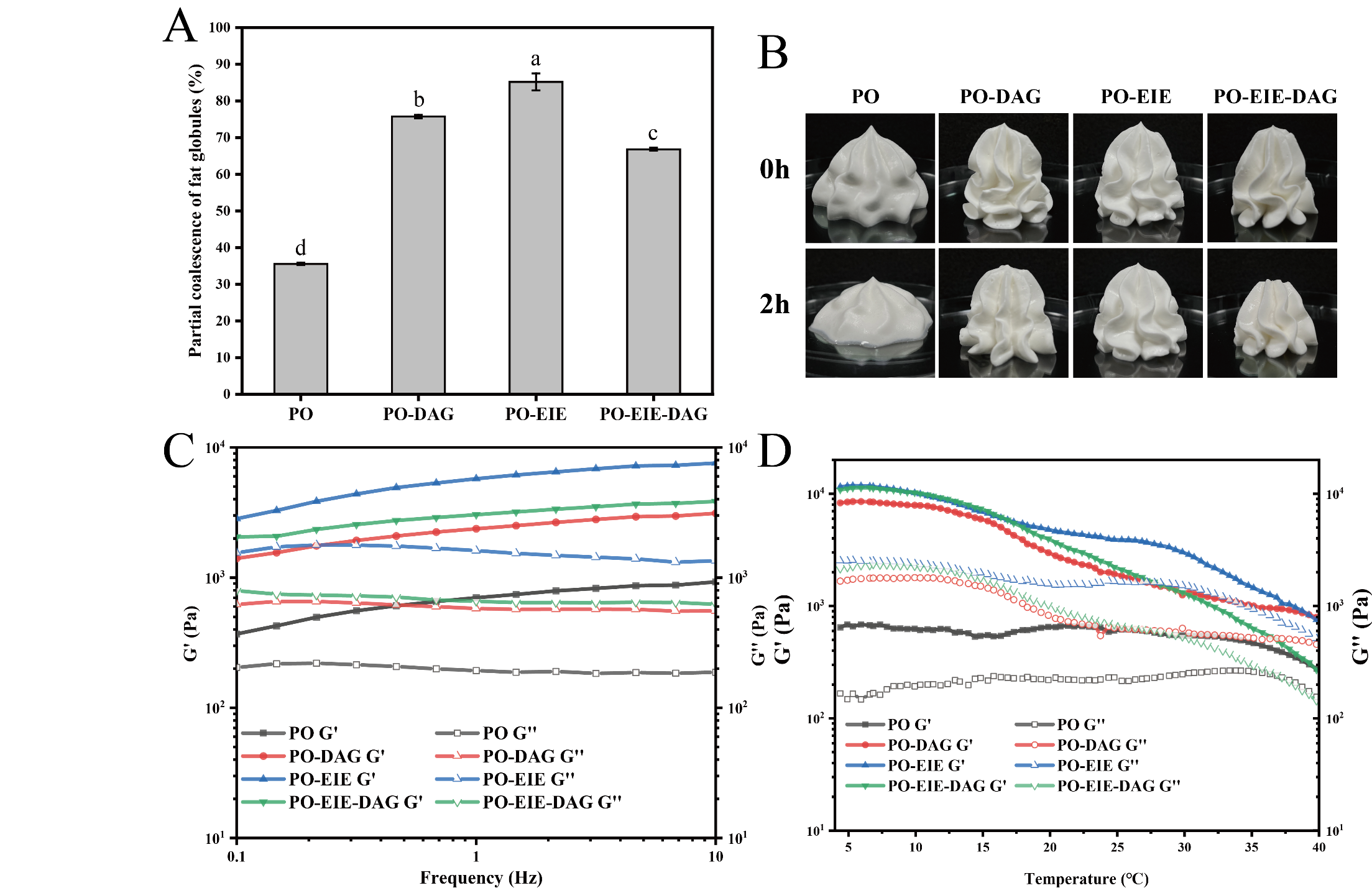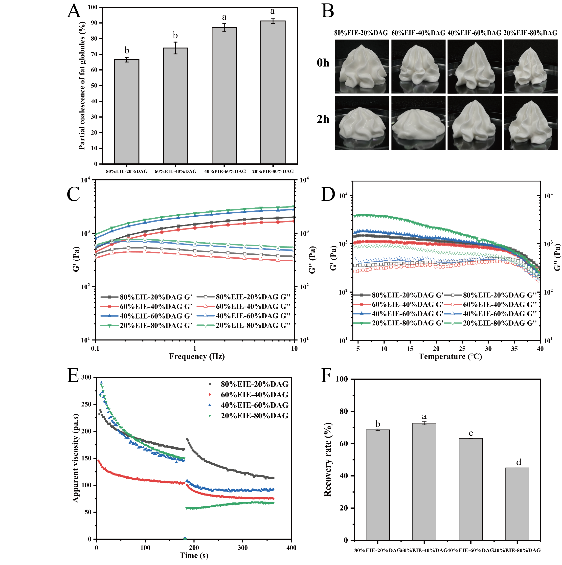 图5 PO-EIE和PO-DAG复配对充气乳液搅打性能的影响。(A)部分聚结。(B)裱花能力。(C)泡沫 G′和 G“随频率的变化。(D)泡沫 G′和 G“随温度的变化。(E)蠕变恢复曲线。(F)恢复率。