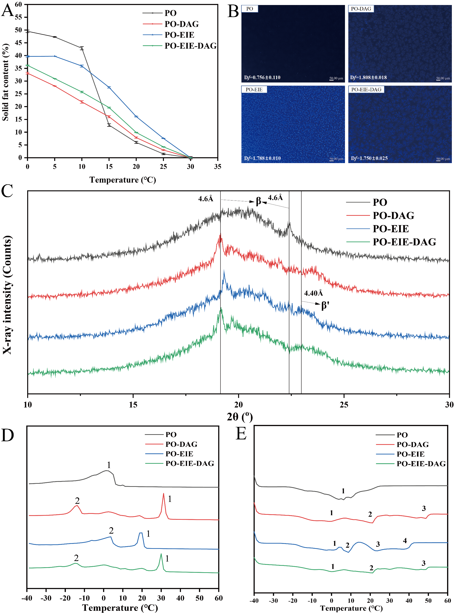 图2棕榈液油酶促改性油脂的结晶特性。(A)固体脂肪含量。(B)晶体形态和分形维数。(C)X 射线衍射图。(D)结晶曲线。(E)熔融曲线。