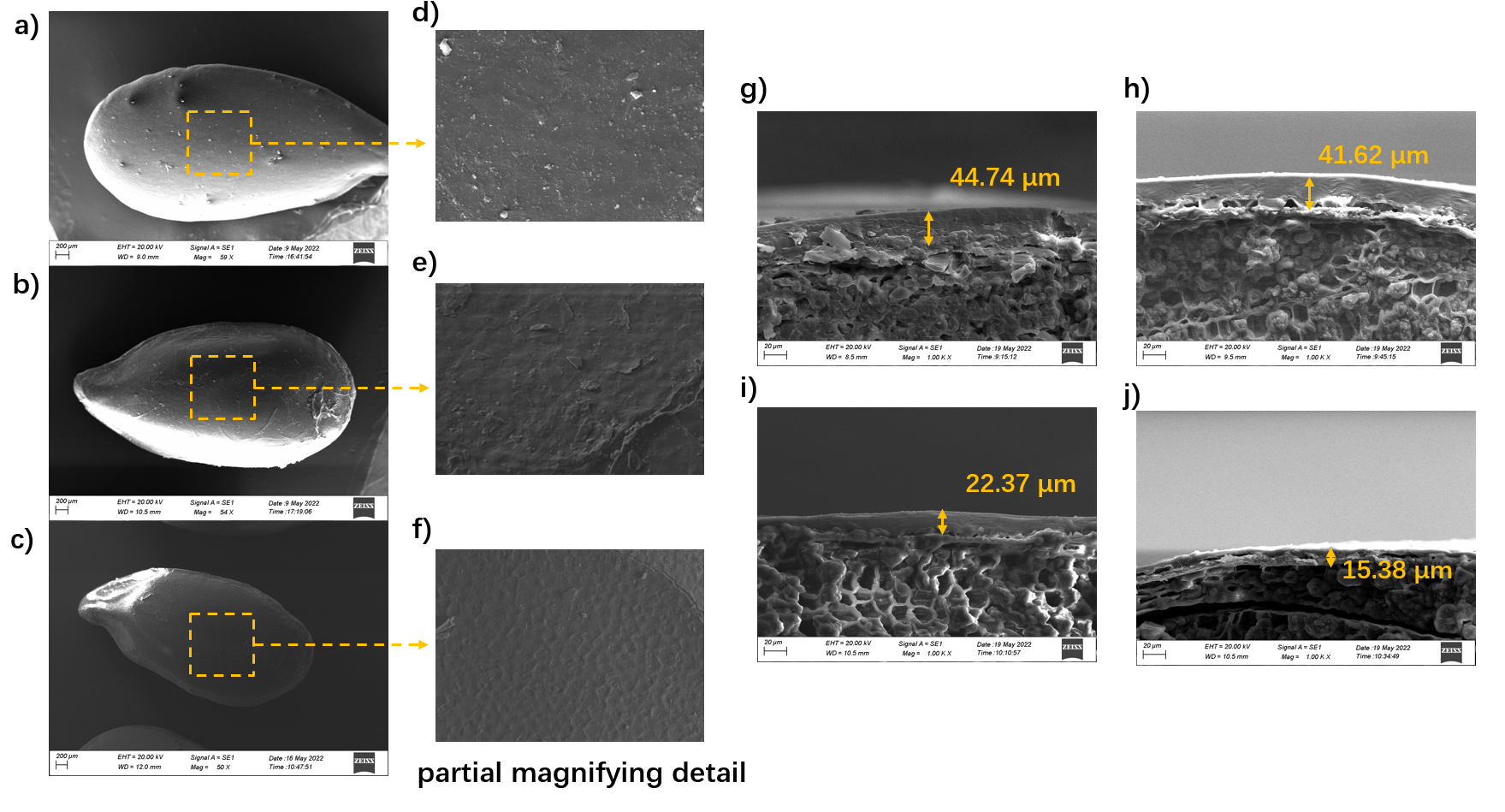 脱胶被认为和烘焙亚麻籽的储藏稳定性息息相关。一方面,较低的脱胶程度不利于消除亚麻籽的粘牙感。而深度脱胶在带来更好的口感的同时也会破坏亚麻籽表面天然的保护性结构,使亚麻籽更易受外界环境影响,不利于储藏。通过观察不同脱胶程度的亚麻籽的微观结构和对比其过氧化值和蛋白质巯基值,并建立宁亚-19的保质期预测模型,发现经中等脱胶(最佳脱胶条件)处理的亚麻籽胶层厚度为22.37 μm, 25℃下的保质期为612天。这一状态的烘焙亚麻籽在提高了口感的同时保证了一定的储藏稳定性。